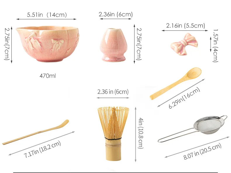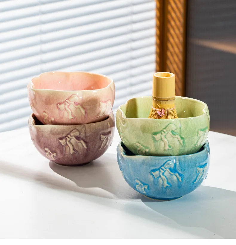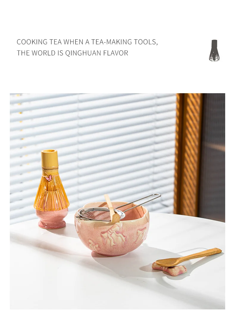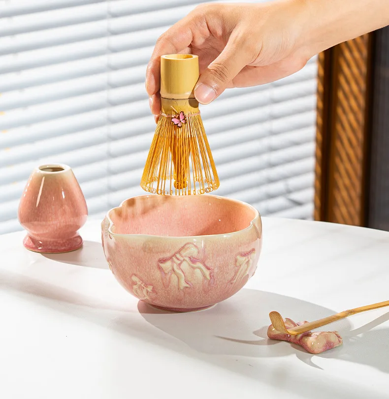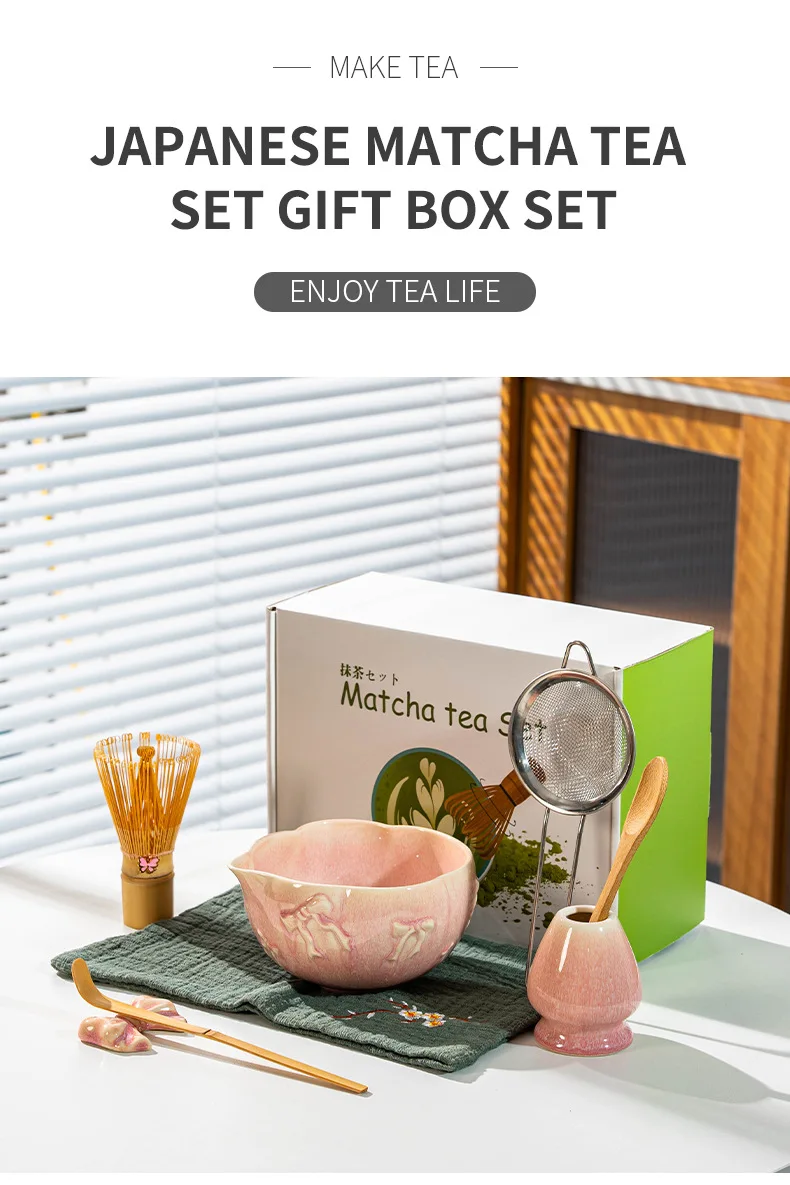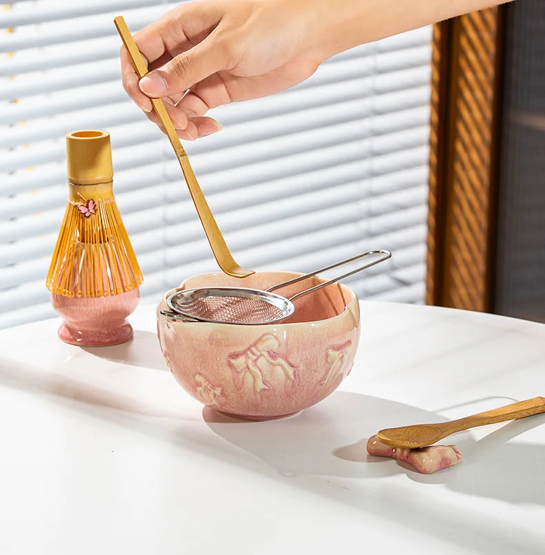 Porcelain Heart-Shaped Matcha Bowl with Spout, Japanese Matcha Set 7-Piece, Bow-Tie Chasen Gift Box